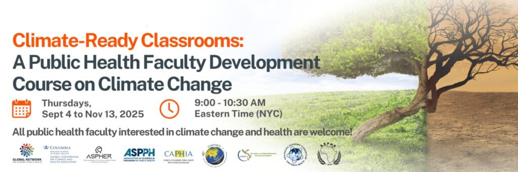 The Global Network for Academic Public Health (GNAPH), in collaboration with the Global Consortium on Climate and Health Education (GCCHE), recently concluded Climate-Ready Classrooms: A Public Health Faculty Development Course on Climate Change – a free, 11-session virtual course that reached over 1,000 faculty participants worldwide. Designed to strengthen climate-health teaching capacity across regions, the course equipped educators with the knowledge, skills, and tools to integrate climate change into public health curricula.
